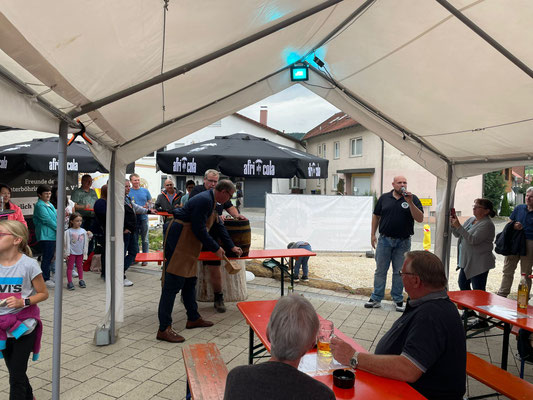 Auch Bürgermeister Heim richtete einige Worte an die Gäste. Er würdigte das starke Miteinander und das vorbildliche Engagement der Dorfgemeinschaft für ihre neue Mitte. Pfarrer Georg Braunmüller sprach den kirchlichen Segen für das Projekt, bevor Bürgermeister Heim mit dem traditionellen Fassanstich die Feierlichkeiten offiziell eröffnete.