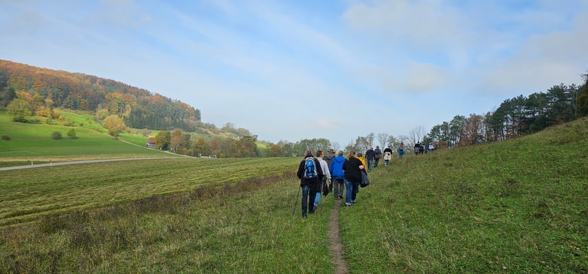 Bei trockenem Herbstwetter trafen sich rund 60 Wanderbegeisterte pünktlich an der Bushaltestelle in Unterböhringen. Nach einer kurzen Begrüßung ging es um 10:30 Uhr los: Die Wandergruppe machte sich über den Linsenberg und den Sattel auf den Weg hinauf zum Dalisberg. Oben angekommen, warteten bereits etwa 20 weitere Wanderfreunde, die die andere Route über den Fahrweg gewählt hatten.