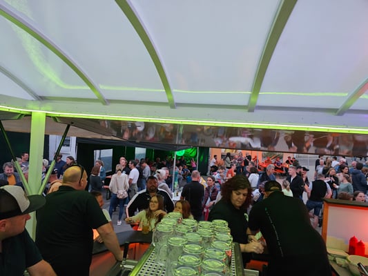 Zum Hock waren wir mit viel Equipment angereist: Mit unserem Ausschankwagen sowie den Gastrozelten und allerlei Gerätschaften wie Grills und Spülmaschine und