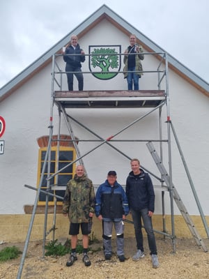 der Familie Mann und Familie Franke haben in mühevoller Arbeit das Wappen angebracht. Wie jeder weiß, ist dieses trotz Eingemeindung ein zentrales Symbol und Identifikation für uns