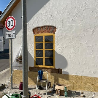 Bei den Arbeiten kam auch ein Fenster zum Vorschein, welches vor über 100 Jahren zugemauert wurde um den Anbau des damaligen Wohnhauses zu ermöglichen. Die noch vorhandenen Reste wurden von den Mitgliedern liebevoll herausgearbeitet. Die Unterböhringerin Ute Staudinger komplettierte dieses Element mit einer ansprechenden und sehr schönen Fensterzeichnung.